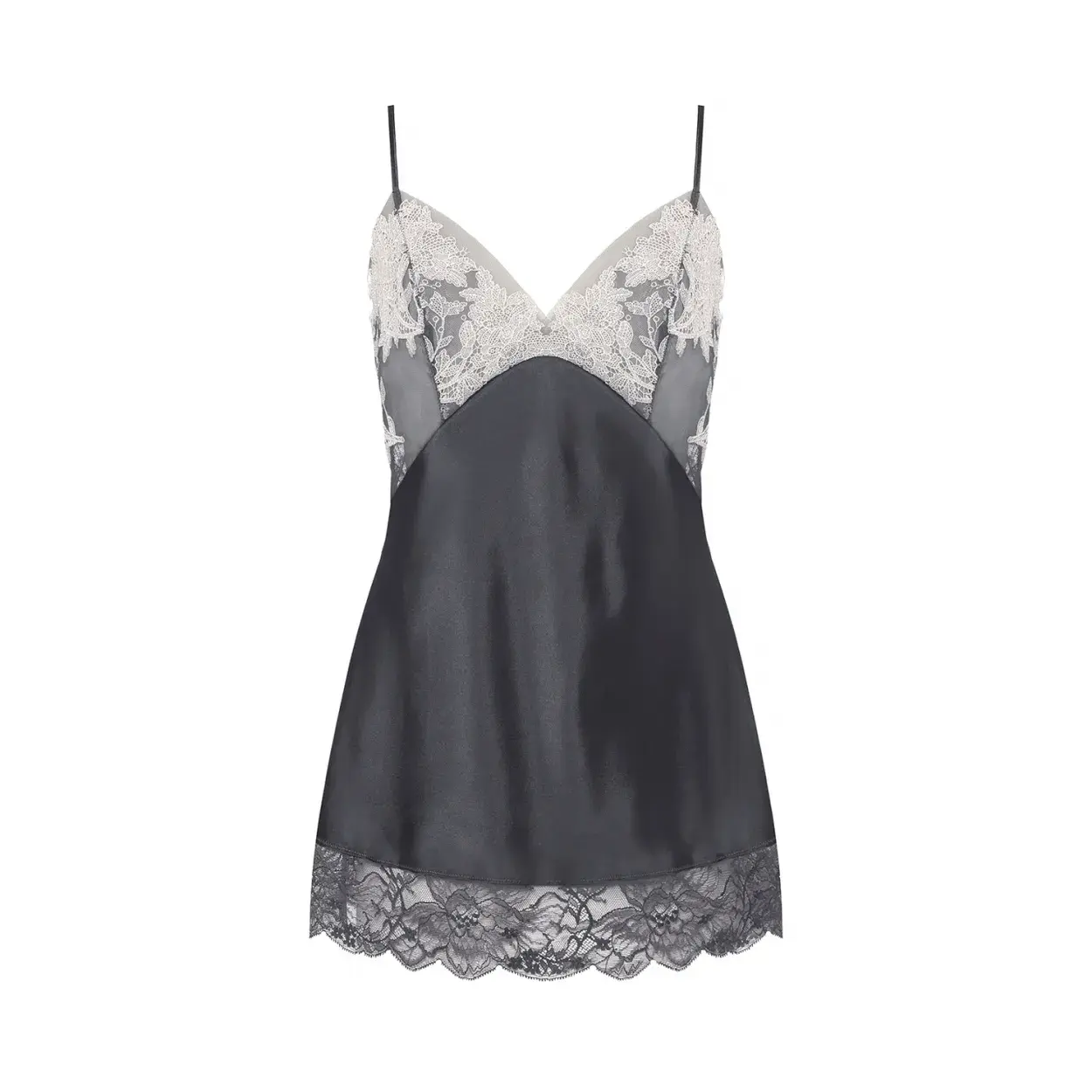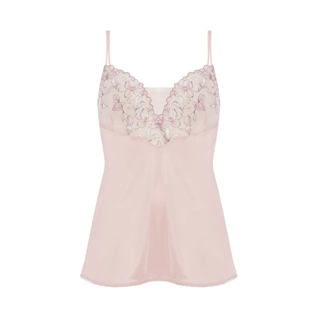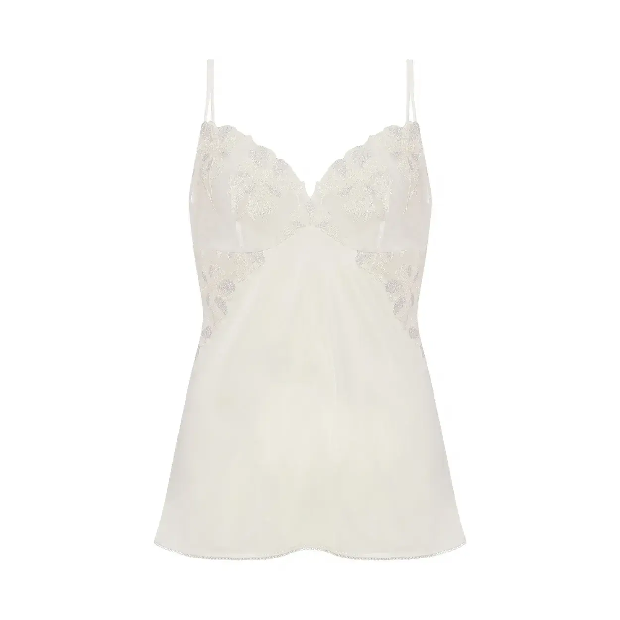 身生地にはストレッチサテンを使用し、光沢が美しいキャミソールです。カップには圧倒的な存在感を放つダリアをイメージしたレースを施し、背部はストレッチリバーレースをあしらったデザインです。ストラップにアジャスターがついているので長さの調節が可能です。