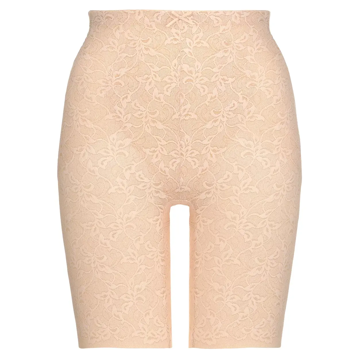 マットな糸と光沢のある糸を使い分けた立体感のある上品なレースを使用しています。伸縮性に優れたウエスト部メッシュ仕様(特許取得済)で、締め付け感が少なく、快適なはきごこちです。身生地には、しっかり押さえて楽な着けごこちの素材を使用しています。テープ類は全て肌側がやわらかな素材を使用しています。脚口はフラット仕様のため、段差がつきにくく、アウターにひびきにくくなっています。