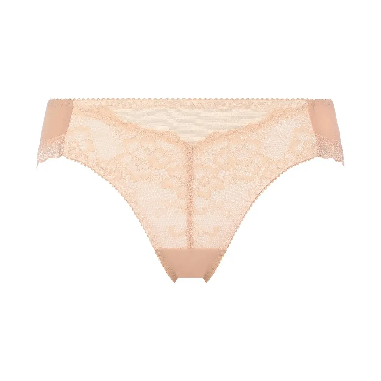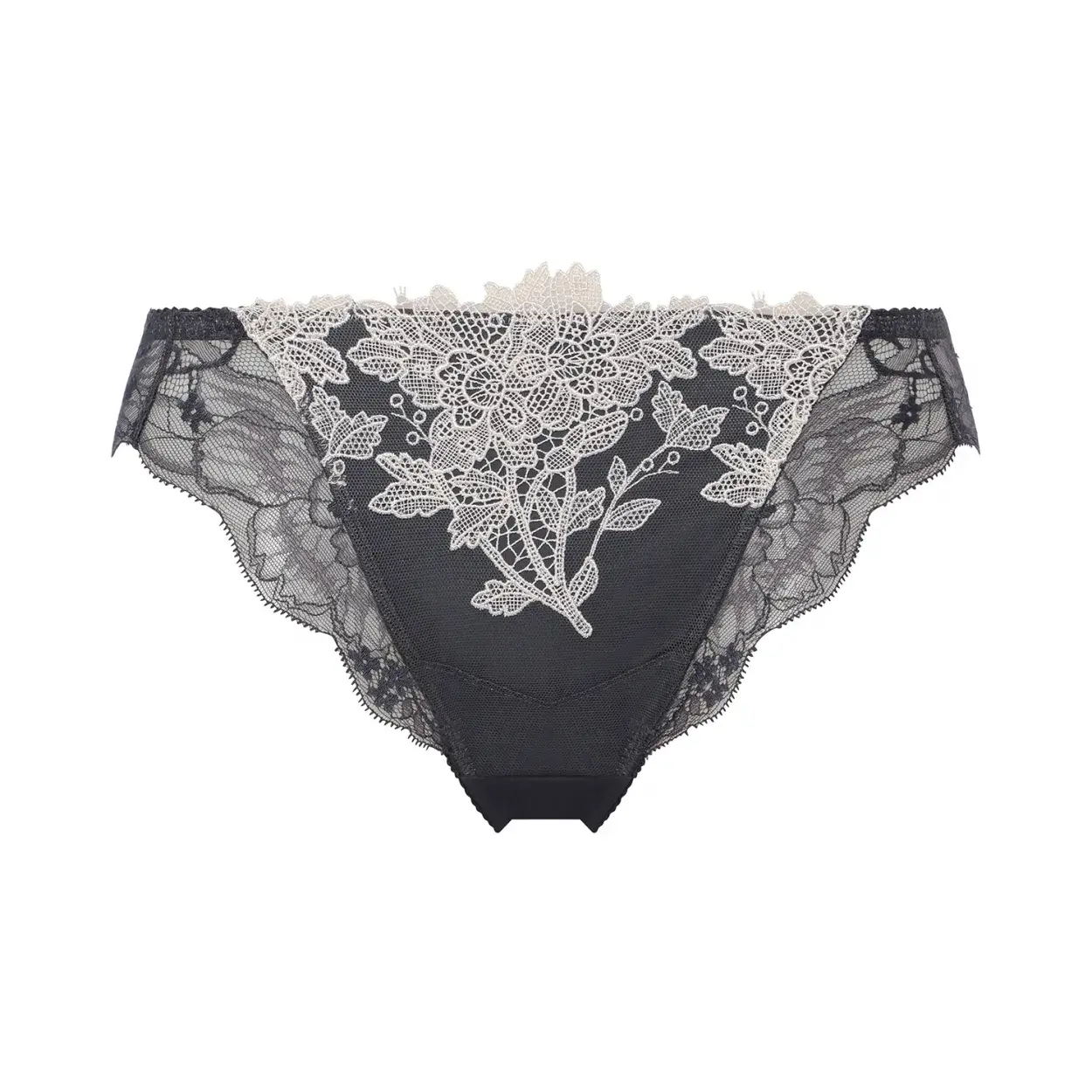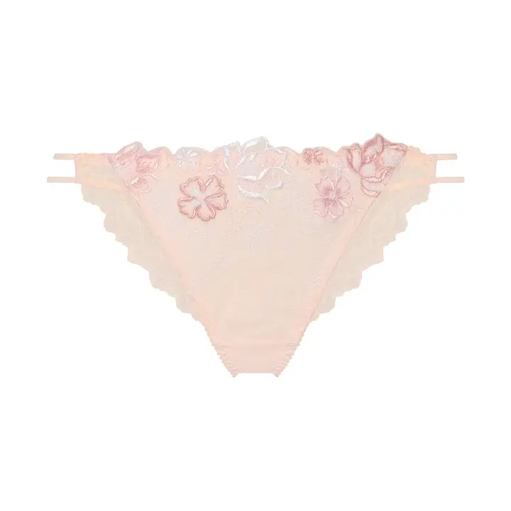 豪華で煌びやかなロココスタイルを現代風にアレンジした華やかなデザインのシリーズです。マルチカラーの大ぶりなモチーフが、より特別感を演出します。マチ部分には、伸縮性のあるソフトな風合いのツーウェイ素材を使用しています。バックスタイルが総レース仕様のブラジリアンタイプのストリングです。サイドから後ろにかけてレース素材のため肌が透けます。