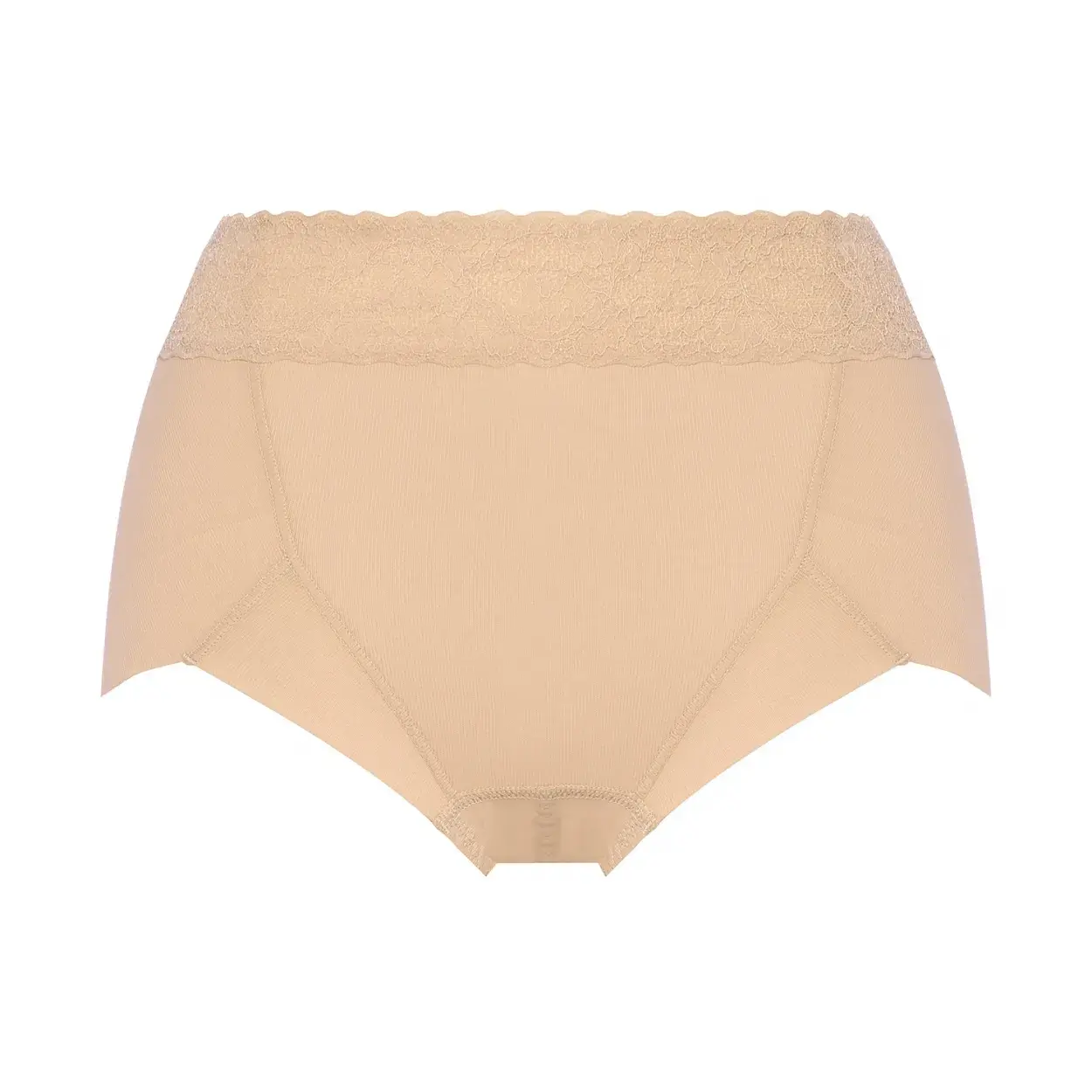 生地には伸縮性に優れ、肌ざわり滑らかな綿混素材を使用しています。おなか部分は綿混素材のパワーネットで裏打し、ほどよくおなかをおさえます。生地にレースを重ねることで、レースが直接肌にあたらない仕様です。ナプキンの羽を内側にたたみ込める二重構造のマチ仕様です。マチ中央から施したバックシームギャザリングで、ヒップにぴったりフィットします。脚口はフラットで、アウターにひびきにくくなっています。