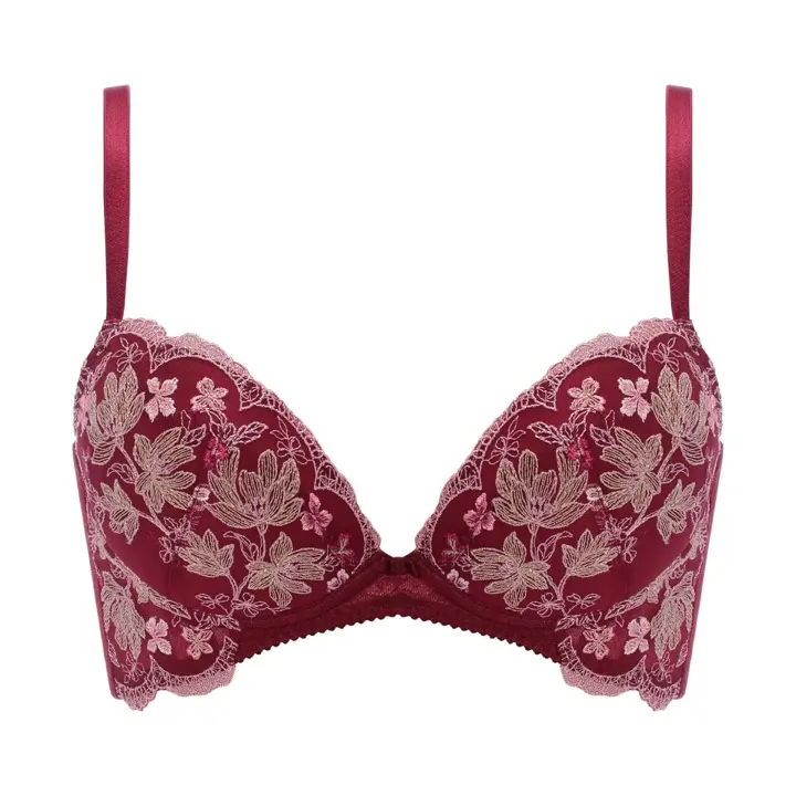 花々を散りばめた柄の刺しゅうがかわいらしく、優しい印象のブラ。カップの外側にもカップと同じベースカラーとのコントラストを効かせた花柄の刺しゅうレースを施しています。バストをふんわりと優しく包み込むフィット感で、上質で柔らかい素材は軽くて動きやすく窮屈さを感じさせません。