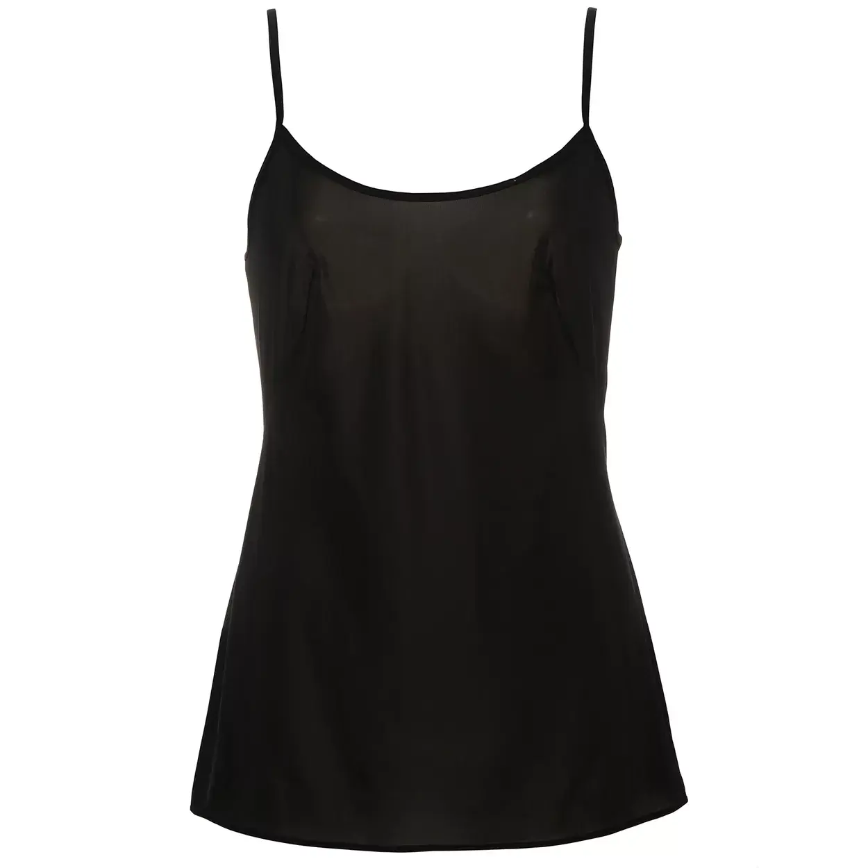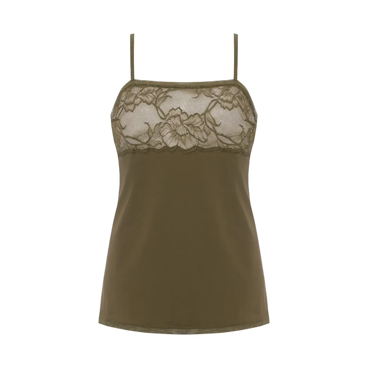 身生地には光沢が美しいキメの細かい滑らかな肌ざわりの素材を使用しているので、肌に優しくフィットします。胸元から背中に幅広くストレッチレースを使用した大胆なデザインです。キャミソールは洋服を着やすくし、着崩れを防ぎます。