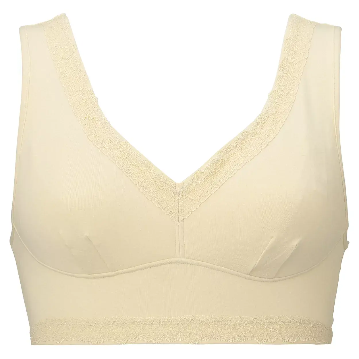 胸をやさしく包み込むノンワイヤータイプで、楽な着用感なので、ほっとリラックスしたい時におススメです。天然保湿成分(スクワラン)をレーヨンに練りこんだ素材を使用しています。身生地はベア天竺を使用しているので、伸縮性があります。
