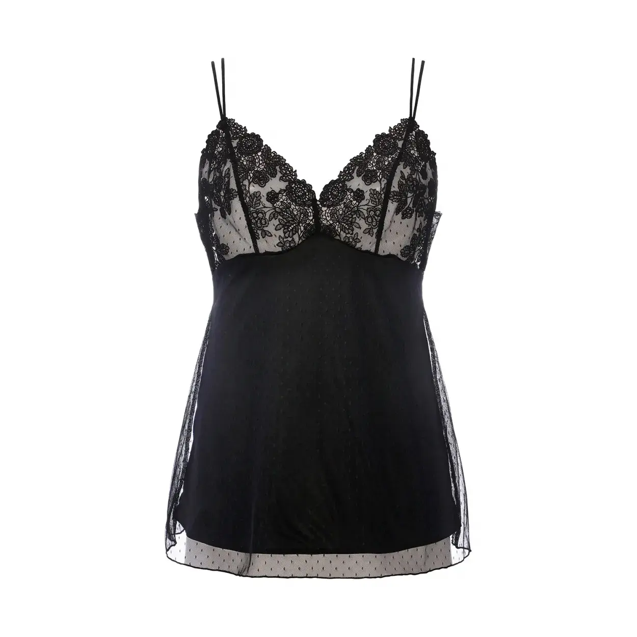 身生地には光沢が美しいキメの細かい滑らかな肌ざわりの素材を使用しているので、肌に優しくフィットします。透明感のあるドットチュールネットを重ねたドレスのようなデザインです。背中に幅広くストレッチレースを使用しているので優しいフィット感です。