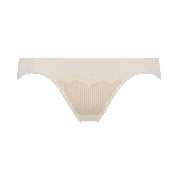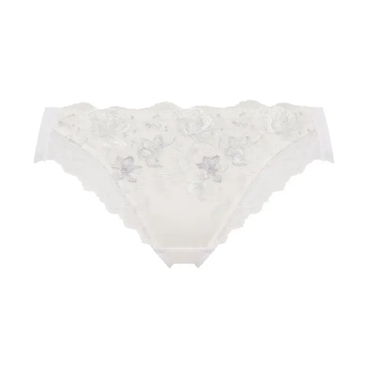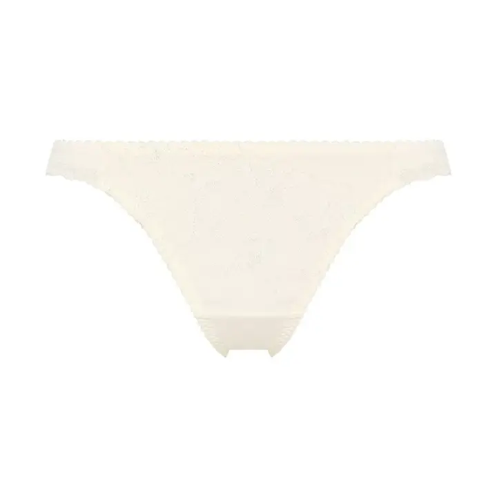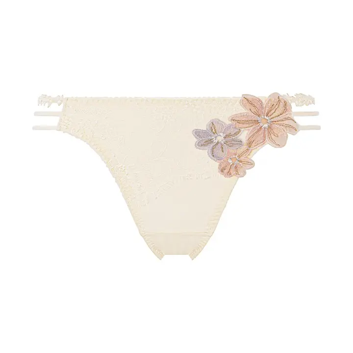 サイドからバックにかけてストレッチリバーレースを使用しているので、やさしくフィットし、とてもエレガントです。フロントにはカメオをイメージした繊細なエンブロイダリーレースが美しくあしらわれたストリングです。
