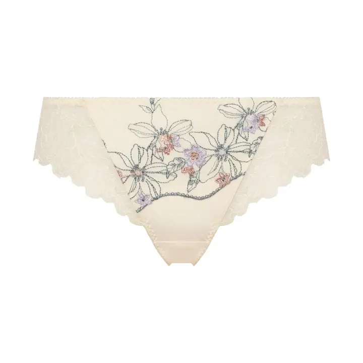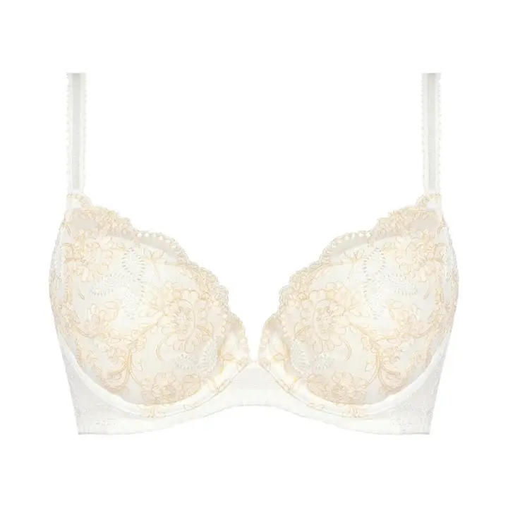 シンビジウムの花をイメージしたチュールエンブロイダリーのステッチが繊細で美しいブラジャーです。センター低めでサイドからバストを中央に寄せ、きれいな谷間をつくります。サイドはやや高めで、すっきりとしたシルエットでアウターにひびきにくいです。