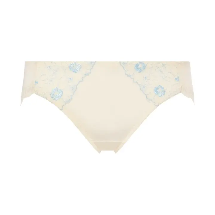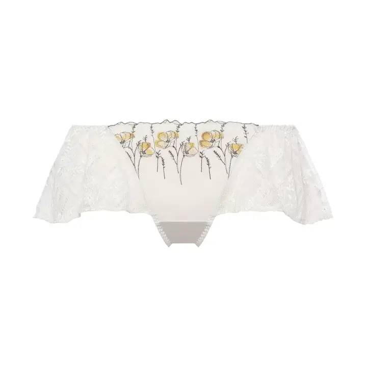 マーガレットのレースがフリルのようにあしらわれた異素材の組み合わせで表現したシリーズです。身生地には光沢が美しくなめらかな肌ざわりのマイクロファイバー素材を使用しています。脚口にはストレッチレースを使用しているので、やさしくフィットします。