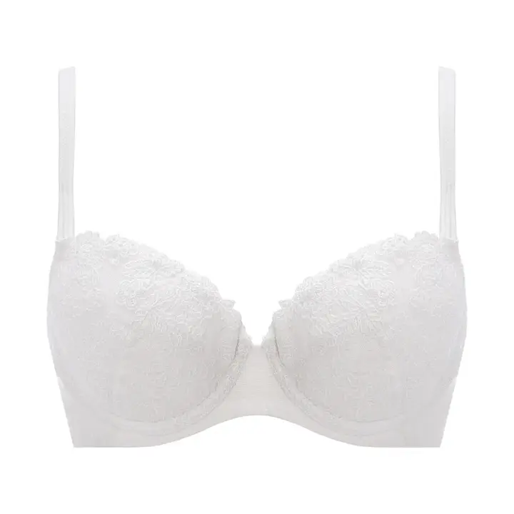 心ときめくロマンティックなフランネルフラワーの普遍的な美しさを繊細なレースで表現したシリーズです。カップ中央のセンターが低いパターンなので、サイドからバストを寄せ、きれいな谷間を作ります。サイドから脇がやや高めで、すっきりとしたシルエットでアウターにひびきにくいです。